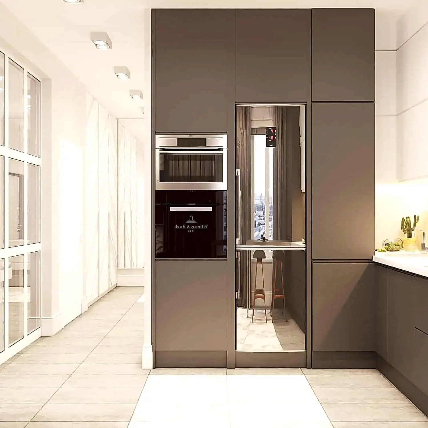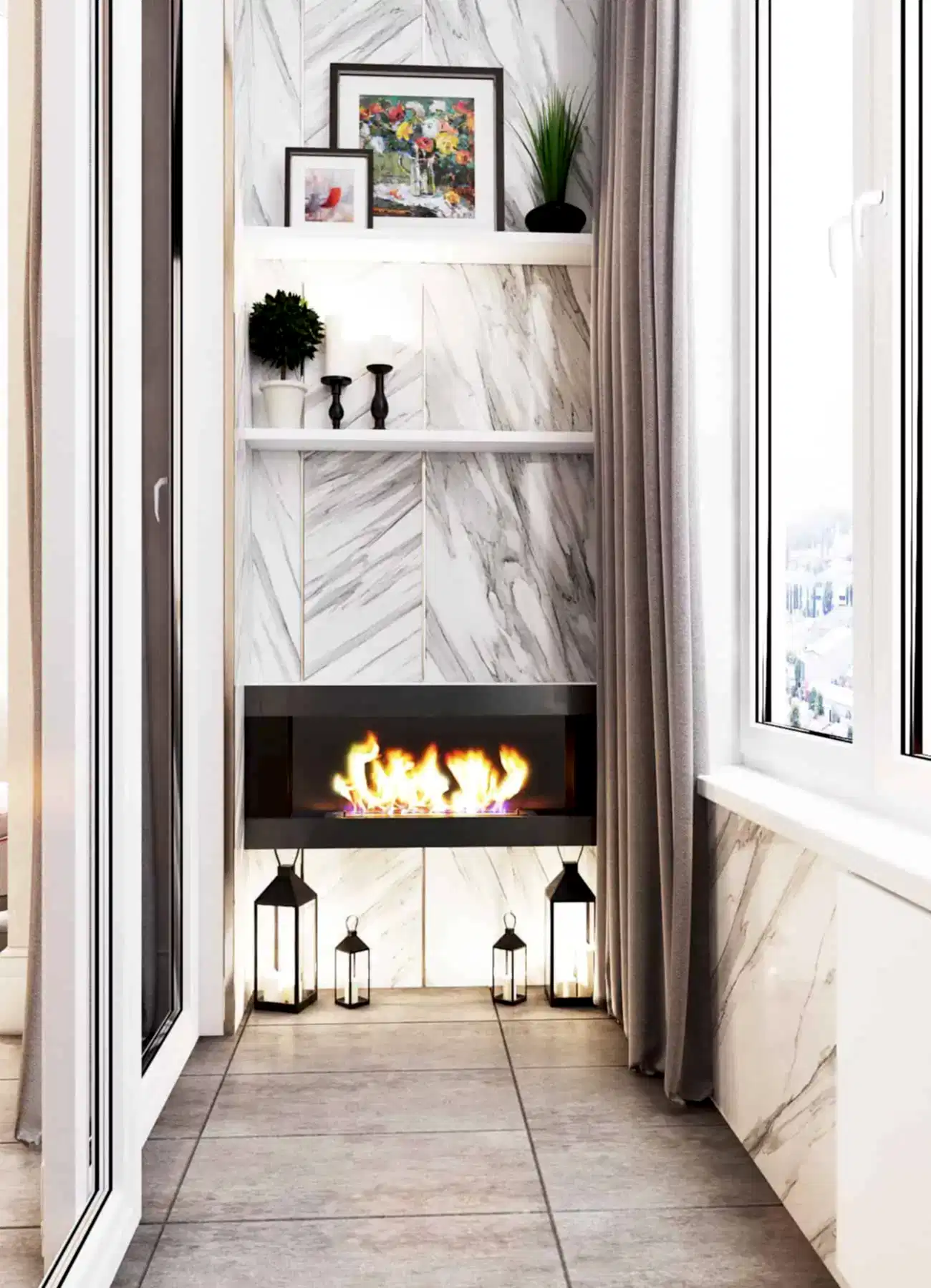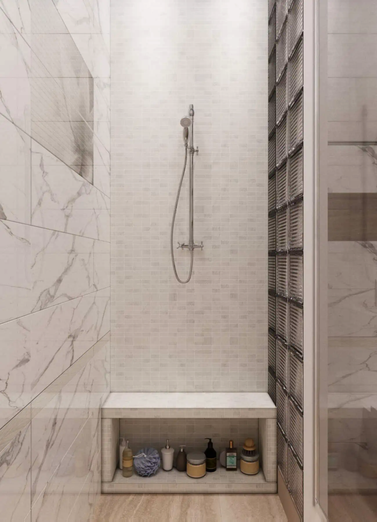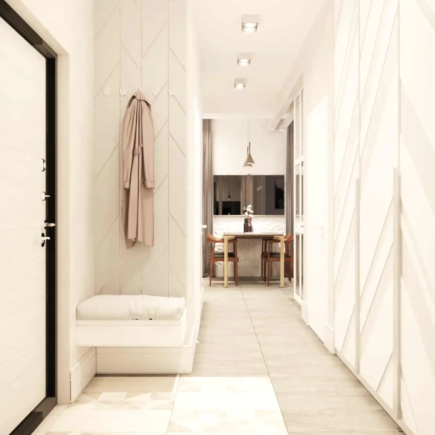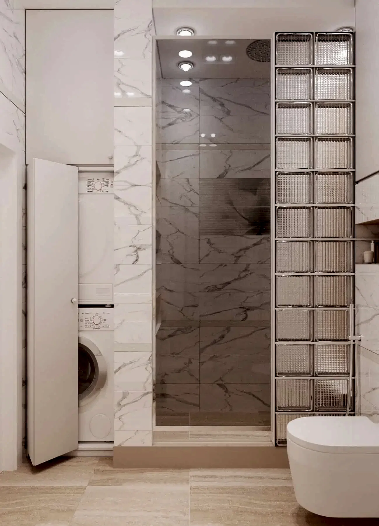 В коридоре был установлен вместительный шкаф, где будет храниться пылесос. В ванной комнате мы учли размещение стиральной и сушильной машины, а также стеклянные Pin-Up которые становятся очень актуальными☘️. Белый под мрамор керамогранит создал дополнительный уют в данном помещении.